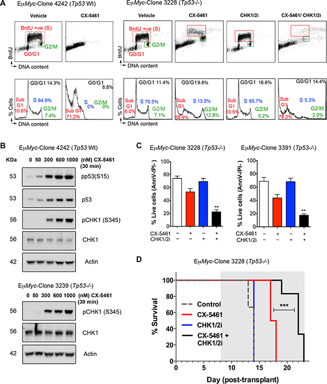 Figure 5: CX-5461 combination with a dual CHK1/CHK2 inhibitor induces cancer cell death of Tp53-null (Tp53−/−) Eμ-Myc lymphoma cells in vitro and in vivo. (A) Cell cycle analysis using BrdU incorporation (upper panels) and PI staining for DNA content (lower panels) was performed of p53 wild-type (Tp53 Wt) and (Tp53−/−) Eμ-Myc lymphoma cells following 24-hour treatment with vehicle, 100 nM CX-5461, 30 nM AZD7762 (CHK1/2i) or combined 100 nM CX-5461/30 nM CHK1/2i. Analysis was performed as in Figure 2A (representatives of n = 3). (B) Western blotting analysis of phosphorylated and total protein levels of p53 and CHK1 in Tp53 Wt and Tp53−/− Eμ-Myc lymphoma cells following 30 min treatment with CX-5461 as indicated. Actin levels were used as a loading control. (C) Percentages of live Tp53-/- Eμ-Myc lymphoma cells (Annexin V –ve/ PI –ve) cells treated as in (A) (n = 3), error bars represent mean ± s.e.m., **p-value < 0.01 compared to corresponding CX-5461 treated samples. (D) CX-5461 combination with CHK1/2i leads to improved therapeutic benefit in treating transplanted Tp53−/− Eμ-Myc lymphoma cells in vivo. Kaplan-Meier curves showing increased survival of mice transplanted with Tp53−/− Eμ-Myc lymphoma (clone 3228) treated daily with 20 mg/kg AZD7762 (CHK1/2i) every weekday, CX-5461 at 30 mg/kg every third day or combined CX-5461+CHK1/2i (***p < 0.0001; n = 6 in every treatment group). Treatment period is indicated by the grey area.