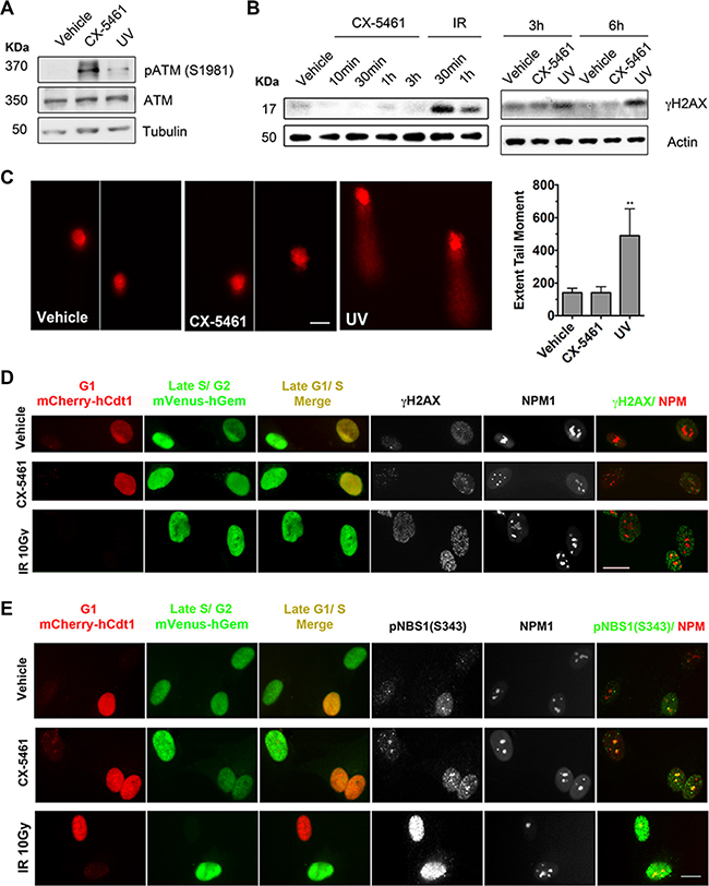 Figure 6: CX-5461 activates ATM signaling within the nucleoli in the absence of DNA damage. (A) BJ-T cells were treated with vehicle, 1 μM CX-5461 or 100 J/m2 ultraviolet (UV) irradiation and incubated for 2 h. Total protein lysates were extracted and western blotting analysis of phosphorylated and total ATM and Tubulin levels (Representative o f n = 3). (B) BJ-T cells were treated with vehicle, 1 μM CX-5461 or 10 Gy ionizing radiation (IR) as indicated. Total protein lysates were extracted and western blotting analysis of γH2AX and Tubulin levels was performed. IR treatment was used as a positive control for induction of γH2AX levels (representative of n = 3). (C) Alkaline comet assay analysis of DNA damage following 1 μM CX-5461 treatment for 30 min (n = 4). UV irradiation (500 J/m2) followed by 30 min incubation was used as a positive control for induction of DNA damage. Quantitation of extent of tail moment, which is a product of tail length and the percentage of tail DNA was performed using Metamorph software and normalized to vehicle control. Scale bar = 20 μM. Error bars represent mean ± s.e.m., **p < 0.001. (D) Co-immunofluorescence analysis of γH2AX and (E) pNBS1(S343) with NPM1 in FUCCI-labeled BJ-T p53sh treated with vehicle, 1 μM CX-5461 or 10 Gy IR for 1h. FUCCI cells express a fragment of Cdt1 linked to the fluorescent protein mCherry (monomeric Cherry) during the G1 phase of the cell cycle, as well as a fragment of Geminin linked to the fluorescent protein mVenus (monomeric Venus) during the S/G2/M stages. γH2AX and pNBS1 (S343) overlap with NPM1 in G1/S transition (yellow) or late S/G2/M (green) cells populations were examined in two independent experiments. Scale bar = 10 μM.