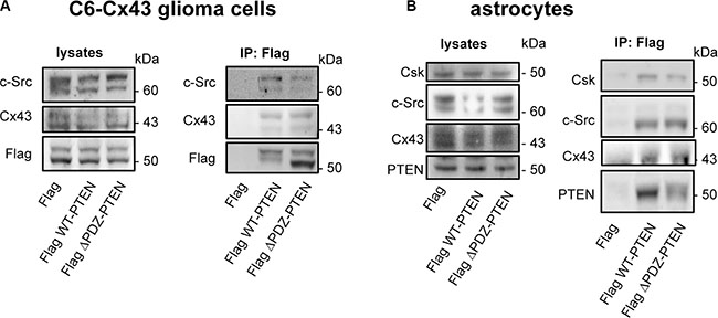 Figure 4: PTEN PDZ domain-binding motif is not required for PTEN interaction with Cx43, c-Src, and Csk. C6-Cx43 cells (A) or astrocytes (B) were transfected with Flag WT-PTEN, Flag ΔPDZ-PTEN (1-400; PTEN lacking the PDZ domain-binding motif) or Flag (control). After 48 h, the cells were lysed, and immunoprecipitations were carried out with antibodies against Flag. Western blotting before (lysates) and after Flag immunoprecipitation for Flag, Cx43, c-Src, PTEN and Csk showing the presence of c-Src and Cx43 in the immunocomplex obtained with both WT-PTEN and ΔPDZ-PTEN in glioma cells expressing Cx43 and the presence of c-Src, Csk and Cx43 in the immunocomplex obtained with both WT-PTEN and ΔPDZ-PTEN in astrocytes that endogenously express Cx43.