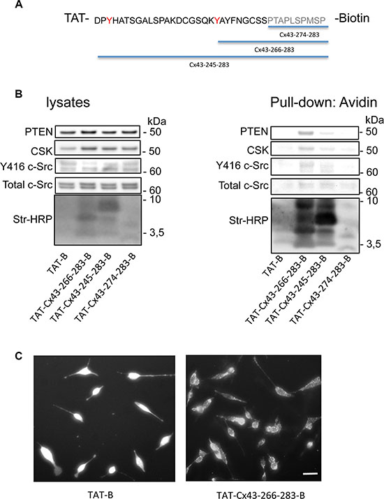 Figure 5: The Cx43 region involved in the recruitment of PTEN and Csk. C6 glioma cells were incubated with several cell-penetrating peptides containing the indicated sequences of Cx43 fused to biotin for 30 min. (A) The SH3 domain binding motif is shown in grey and the tyrosines phosphorylated by c-Src in red. (B) After 30 min, the cells were lysed, and pull-down assays were carried out with avidin-conjugated agarose beads. Western blots before (lysates) and after avidin pull-down for c-Src, Csk and PTEN showing the enrichment of PTEN and Csk in the complex obtained with TAT-Cx43-266-283-Biotin and, to a lesser extent, with TAT-Cx43-245-283-Biotin. Str-HRP, HRP-conjugated streptavidin. (C) After 30 min, the cells were fixed, and the uptake of peptides bound to biotin was analyzed by fluorescence microscopy. Scale bars: 15 μm.
