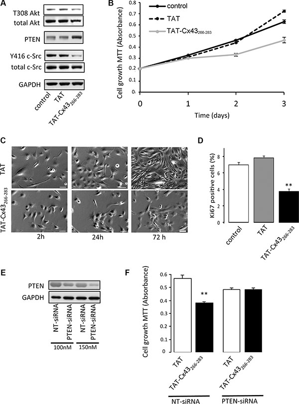 Figure 6: Involvement of PTEN in the antiproliferative effect of TAT-Cx43-266-283 on G166 human glioblastoma stem cells. G166 cells were incubated with 50 μM TAT or TAT-Cx43-266-283 for the indicated times. (A) After 48 h, total c-Src, Y416 c-Src, PTEN, total Akt and T308 Akt levels were analyzed by Western blotting. (B) The cells were plated at a density of 5000 cells/cm2 and the number of living cells was monitored over a 3 day period by the MTT assay. Means ± s.e.m. (n = 3). (C) Representative phase-contrast images showing the inhibition of proliferation promoted by TAT-Cx43-266-283. Scale bars: 50 μm. (D) Percentage of Ki-67-positive cells found after 48h. Means ± s.e.m (n = 3). ** p < 0.01 versus control. (E) G166 cells were plated at 7500 cells/cm2 and transfected with PTEN-siRNA or non-targeting siRNA (NT-siRNA). After 48 h, PTEN levels were analyzed by Western blotting. (F) G166 cells were plated at 7500 cells/cm2 and transfected with 150 nM NT-siRNA or PTEN-siRNA. After 24 h, the cells were incubated with 50 μM TAT or TAT-Cx43-266-283 for 48 h and the number of living cells was analyzed by the MTT assay. Means ± s.e.m. (n = 3). **p < 0.01 versus TAT NT-siRNA.