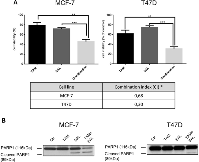 To investigate whether salinomycin has a beneficial effect on the therapy of luminal A breast cancer, it was used as single drug or in combination with tamoxifen to treat MCF-7 and T47D luminal A breast cancer cell lines. Cell viability was examined after 72h of treatment. By calculating the combination index, we observed in both cell lines a synergistic effect of the combinational treatment with tamoxifen and salinomycin [22–24] (Figure 1A). To further validate the increased cytotoxicity poly ADP ribose polymerase (PARP) cleavage, a biomarker for cell death, was analyzed by western blotting. Here, PARP1 was cleaved upon salinomycin treatment in MCF-7 and the combinatorial treatment with salinomycin and tamoxifen in both cell lines (Figure 1B).