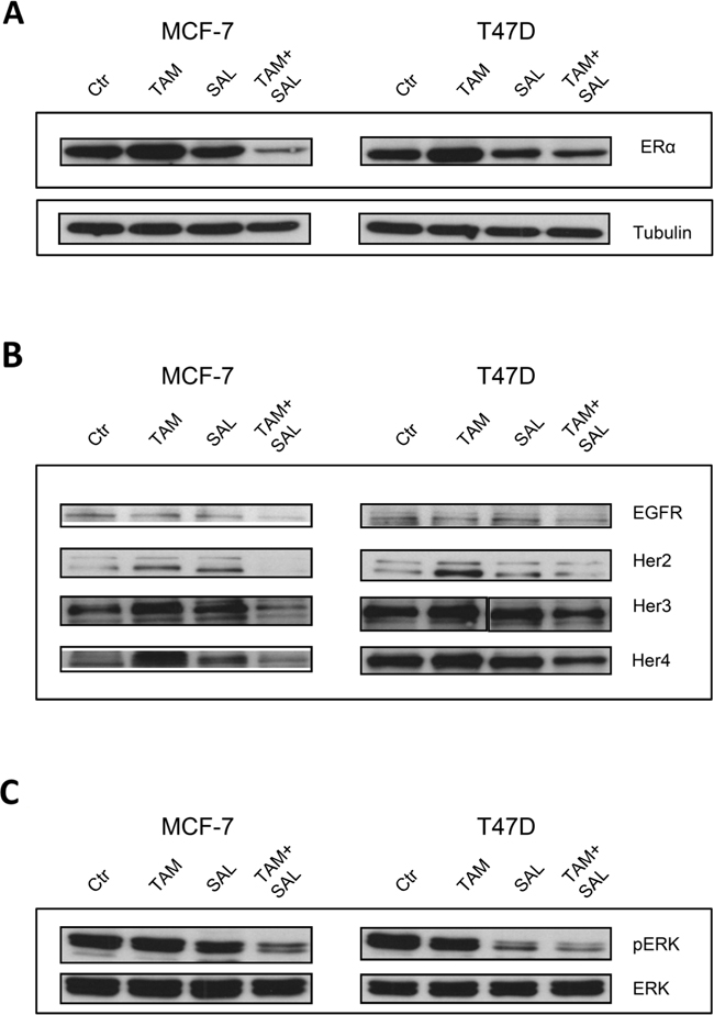 Another important pathway in hormone receptor positive breast cancer is the ligand independent activation of ERα by Egfr-family members which represents an intrinsic resistance mechanism to endocrine therapy. For that reason, the protein expression of Egfr, Her2, Her3 and Her4 were analyzed by western blotting. We found that single tamoxifen treatment increases the expression levels of Her2 (in both cell lines) and Her3 as well as Her4 in MCF-7 cells compared to untreated cells. No changes were detectable in the protein expression of Egfr-family members upon salinomycin treatment. Noteworthy, by applying the combination of tamoxifen and salinomycin the expression level of all Egfr-family members was reduced. We additionally analyzed the gene expression by qPCR and observed a slight reduction after 72 h in all treatment conditions (Supplementary Figure S1). As a consequence of the reduced RTK expression downstream Erk phosphorylation was diminished, too (Figure 2B and 2C).