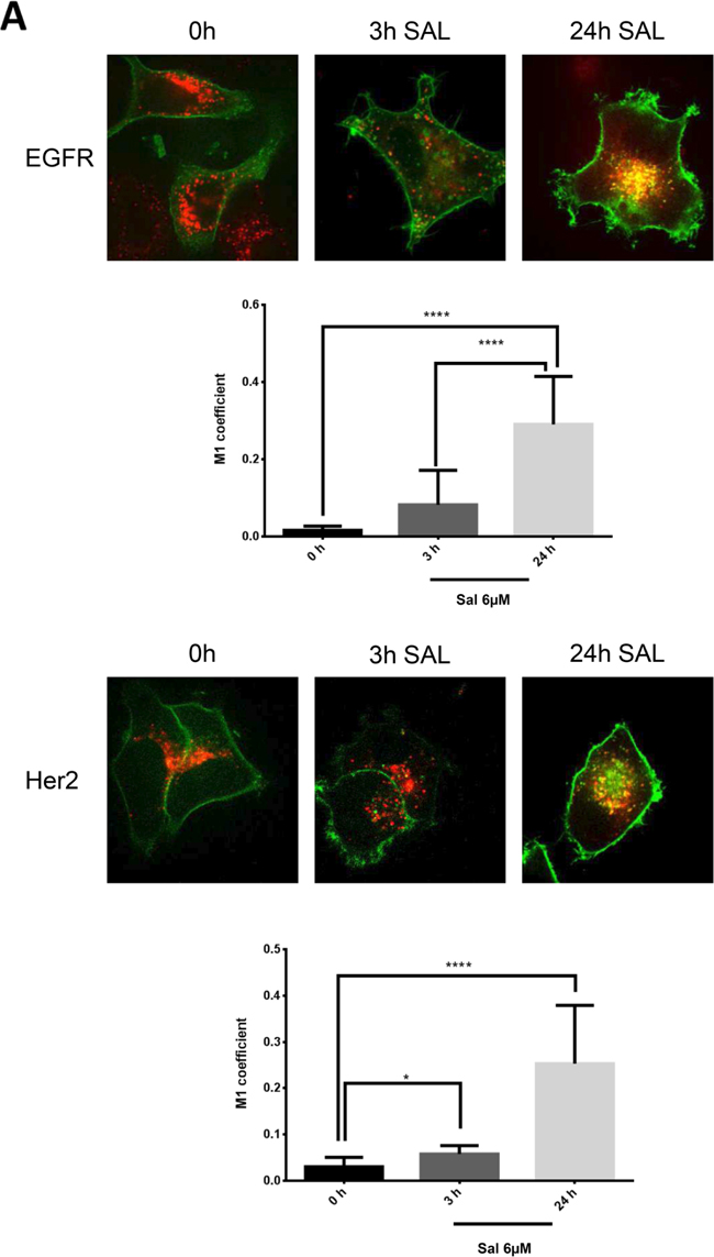 To elucidate the mechanism how the ionophore salinomycin is able to interfere with the ligand independent activation of ERα via Egfr-family members we analyzed the cellular distribution of Egfr and Her2 during salinomycin treatment with spinning disk microscopy. We transfected Egfr and Her2 with a GFP-tag into MCF-7 breast cancer cells to monitor their cellular fate upon salinomycin treatment. Interestingly, we found that salinomycin induces a strong co-localization of these RTKs with the lysosomal marker lysotracker suggesting an enhanced lysosomal degradation after 24h of salinomycin treatment. This is further supported by the quantification of the co-localization with the M1-coefficient (Figure 3A). When cells were stimulated with EGF and treated with salinomycin the receptor disappeared from the membrane and almost completely accumulated in lysosomes after addition of salinomycin. In contrast, without EGF stimulation cells still displayed a cell surface staining indicating a balance between lysosomal degradation and de novo synthesis of these RTKs (Figure 3B).