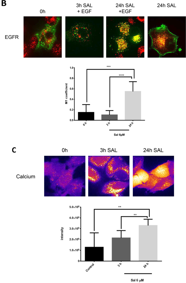 They also seem to be stalled and are no longer transported within the cytoplasm, as depicted in a time projection and videos by live cell imaging of salinomycin-treated HeLa cells (Figure 3D and Supplementary Figure S2). Taken together, these results show that salinomycin reduces the overall protein amount of the Egfr-family by enhanced lysosomal degradation. Furthermore, the salinomycin-triggered elevated cytosolic calcium level leads to pre-mature fusion of endosomes with lysosomes and accounts for decreased RTK expression.