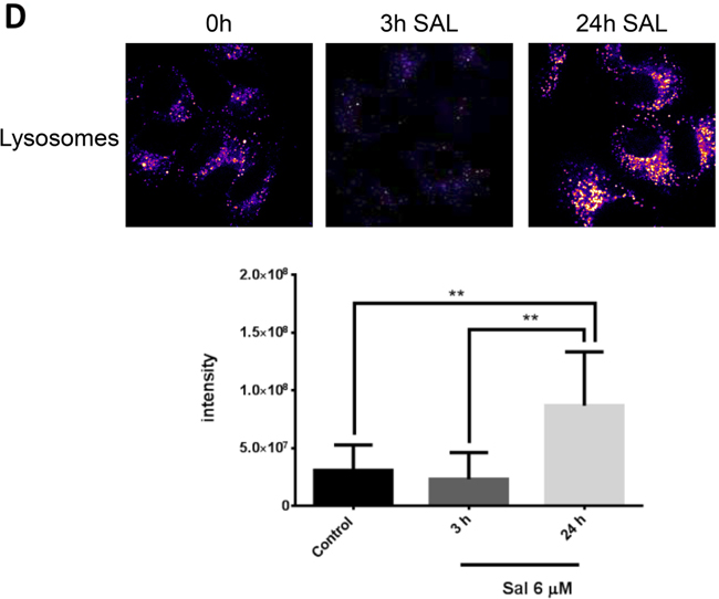 Salinomycin is able to increase the intracellular calcium level as previously shown in neurons [25]. This elevated calcium level, among other factors, is responsible for enhanced endocytosis and premature fusion of lysosomes with endosomes [26, 27]. Thus, we wanted to elucidate whether salinomycin treatment also augments the cytosolic calcium level in breast cancer cells. Our results demonstrate that the intracellular calcium level is significantly increased in MCF-7 cells upon salinomycin treatment as observed by a Fluo-3-AM staining (Figure 3C). By applying lysotracker we found an increased number of lysosomes accordingly.