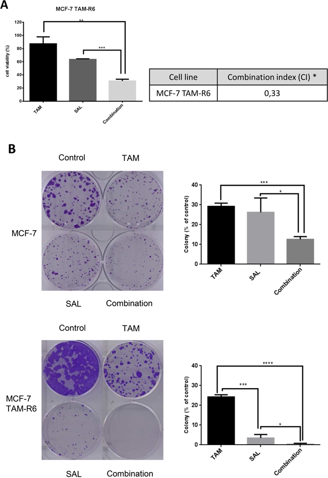 Figure 5: Salinomycin acts synergistic with tamoxifen to circumvent tamoxifen resistance. A. Combinatorial treatment of tamoxifen resistant cells. Cytotoxicity assay of repeatedly treated MCF-7 cells. MCF-7 TAM-R6 cells were treated with 10μM tamoxifen, 0,5μM salinomycin or their combination for 72h. Subsequently cell viability was assessed by Cell Titer Glo® Assay. N=3; * CI<1: synergistic, CI=1: additive, CI>1 antagonistic. B. Clonogenic assay – long-term resistance. To analyze long-term resistance, cells were seeded and incubated for 24h prior to 72h of treatment with 20μM tamoxifen, 10μM salinomycin or their combination. Cells were then grown for 14 days, fixed and stained. Surviving colonies were analyzed by ColonyArea (Image J plug-in), N=3 p-values: *0,05; **0,01; ***0,001; ****0,0001.