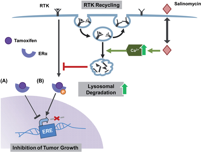 Therefore, we investigated whether salinomycin can be utilized for a combinational approach with tamoxifen and is suitable to circumvent tamoxifen resistance. We demonstrate that salinomycin hampers the ligand independent activation of ERα which is mediated by RTKs. By increasing the intracellular calcium concentration this antibiotic facilitates Egfr and Her2 degradation via lysosomes thus blocking mitogenic signaling. Hence, salinomycin is also able to overcome tamoxifen resistance in luminal A breast cancer rendering salinomycin a promising additive anti-cancer drug.