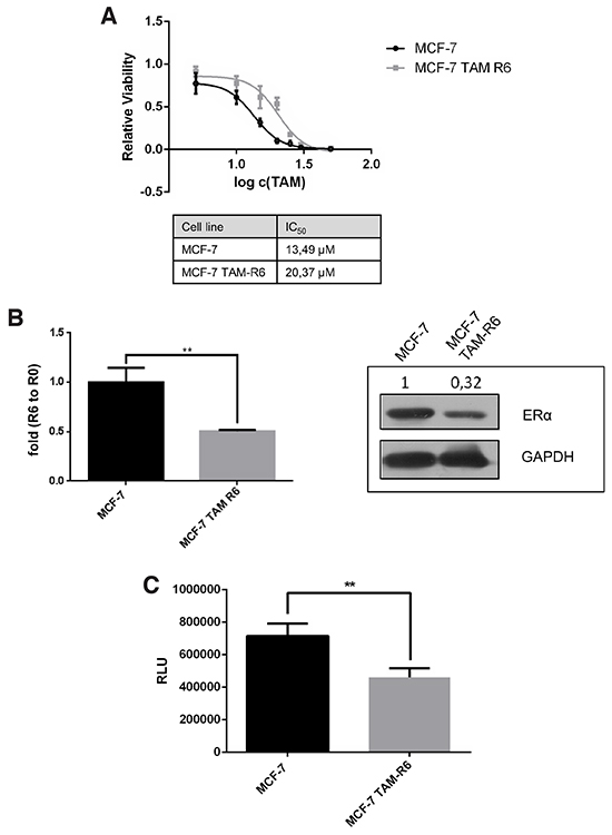 We repeatedly treated MCF-7 breast cancer cells with tamoxifen (these cells are termed MCF-7 TAM-R6 in the following). After six treatment cycles the sensitivity to tamoxifen was determined. In MCF-7 TAM-R6 cells the IC50 was 1,5x higher compared to parental MCF-7 cells reflecting acquired tamoxifen resistance (Figure 4A). Moreover, we observed a decreased mRNA level as well as protein amount of estrogen receptor alpha (ERα) in MCF-7 TAM-R6 cells (Figure 4B).