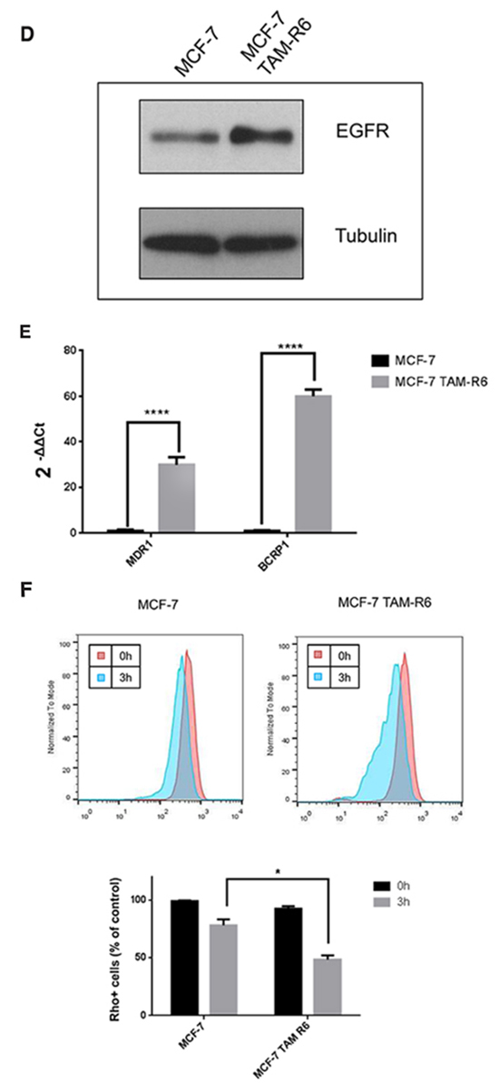 We observed that repeated tamoxifen treatment augments the expression of both multidrug resistance pumps causing an increased efflux of drugs and thus acquired resistance to tamoxifen (Figure 4E). In order to investigate the functionality of these ABC-transporters an efflux assay with rhodamine was performed. We could show that the efflux of rhodamine after 3h was increased in tamoxifen resistant cells compared to parental MCF-7 (Figure 4F).