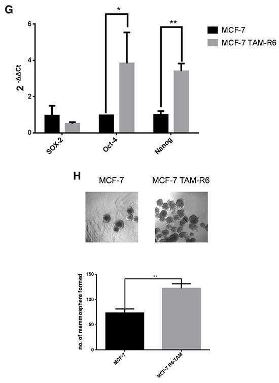 To functionally prove the existence of cancer stem cells, we performed a mammosphere forming assay and determined an increased amount of formed spheroids in MCF-7 TAM-R6 cells (Figure 4H).