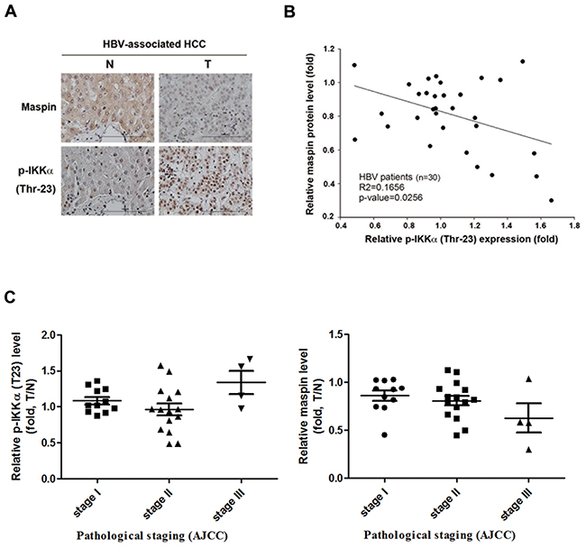Figure 1: Inverse correlation between phospho-IKKα and maspin expression in HBV-associated HCC patients. A. Representative immunohistochemical staining of maspin (top) and phospho-IKKα (Thr-23) (bottom) in HBV-associated HCC tumor liver tissues (T) and adjacent normal liver tissues (N) was shown. Scale bar: 100 μm. B. and C. Total lysates from HBV-associated HCC tumor liver tissues were prepared and subjected to Western blot with anti- phospho-IKKα (Thr-23), maspin, and ERK antibodies. The coefficient of determination (r2) between IKK phosphorylation and maspin expression levels was analyzed by simple regression with normalization to ERK protein level (n=30). The clinical association of p-IKKα and maspin levels with the stages of HBV-associated HCC was further analyzed by a Student’s t-test.