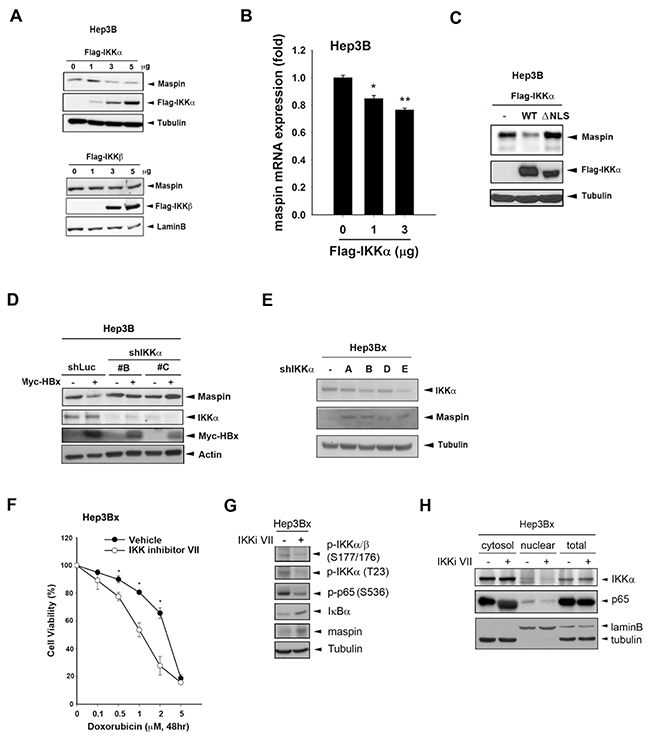Figure 2: Nuclear IKKα mediated HBx-dependent maspin suppression and chemoresistance. A-D. Total lysates from Hep3B cells transfected with IKKα and its NLS deletion mutant IKKβ,myc-HBx along with IKKα shRNA were subjected to Western blot analysis with indicated antibodies. E. Hep3Bx cells were transfected with IKKα shRNA for 3 days, and then total lysates were prepared and subjected to Western blot analysis. F. Hep3Bx cells treated with doxorubicin in the presence or absence of IKK inhibitor VII for 24 hours were subjected to MTT assays to determine the cell viability (n=3). G. and H. After treatment with IKKα inhibitor VII for 48 hours, total, nuclear, and cytosolic lysates from Hep3Bx cells were prepared and subjected to Western blot analysis. The difference was calculated by a Student’s t-test (*: p<0.05; **: p<0.01)