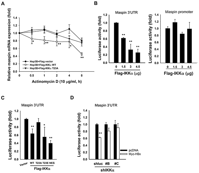Figure 3: Nuclear IKKα disrupted maspin mRNA stability to mediate HBx-dependent maspin suppression. A. Hep3B cells were transfected with Flag-IKKα wild-type and T23A mutant for 3 days and then harvested total RNA at the indicated time points after actinomycin D (10 μ0g/ml) treatment to examine the stability of maspin mRNA by RT-qPCR (n=5). B-D. HEK-293 cells were transfected with maspin 3′UTR or promoter-luciferase gene, Flag-IKKα WT and its mutants, or IKKα shRNA with myc-HBx expression for 24 hours and then were subjected to luciferase activity assays (n=3). The difference was calculated by a Student’s t-test (*: p<0.05; **: p<0.01).