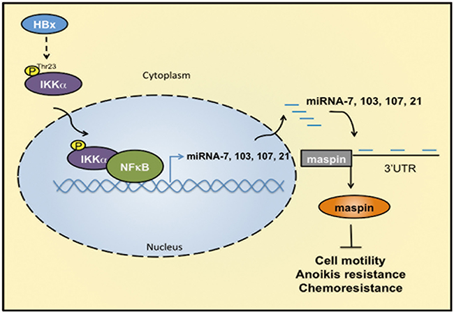 Figure 7: IKKα/NFκB-dependent microRNAs contribute to HBx-mediated hepatocellular tumor progression through suppression of maspin. HBx induces IKKα phosphorylation at Thr-23, leading to its nuclear translocation. Nuclear IKKα cooperated with NFκB to induce miRNA-7, -103, -107, and -21 transcriptions for maspin downregulation by targeting its 3′UTR. Suppression of maspin leads to the motility, anoikis resistance, and chemoresistance of HCC cells.
