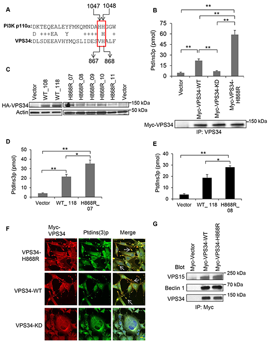 Figure 1: VPS34-H868R exhibits upregulated lipid kinase activity. A. Sequence alignment between human VPS34 and p110α was performed using the NCBI blast alignment tool. B. COS-7 cells were transiently transfected with plasmids encoding the indicated proteins. Anti-Myc antibody was used to immunoprecipitate Myc-tagged proteins. Immunoprecipitates were subjected to an in vitro lipid kinase assay. Ptdins(3)p production (pmol) for each enzymatic reaction was determined by interpolation from the standard curve. Bar graph is representative of two or more experiments and presented in the form of mean ± SEM (**, p < 0.01). The protein levels of Myc-tagged VPS34 proteins immunoprecipitated from whole cell lysates (WCL) were detected by Western blot analysis using anti-Myc antibody. C. NIH3T3 cells stably expressing HA-VPS34-WT, HA-VPS34-H868R, or empty vector were generated by co-transfection of the indicated pJ4-HA-VPS34 constructs with pcDNA3 empty vector. Stable expression of HA-VPS34-WT and HA-VPS34-H868R clones were determined by Western blot analysis using anti-HA antibody. Actin Western blot analysis of WCL was done to control for equal loading. From now on, actin Western blot analysis was performed to confirm equal loading. D. In vitro lipid kinase assay was performed with cell lines stably expressing Vector, HA-VPS34-WT (clone WT_118) and HA-VPS34-H868R (clone H868R_07) after immunoprecipitating the protein using anti-HA antibody. Ptdins(3)p production (pmol) for each enzymatic reaction was determined by interpolation from the standard curve. Bar graph is representative of two or more experiments and presented in the form of mean ± SEM (*, p < 0.05; **, p < 0.01). E. The methods were the same as described in Figure 1D except that the in vitro lipid kinase experiment was done using a different HA-VPS34-H868R clone (H868R_08). F. NIH3T3 cells were seeded overnight in fibronectin-coated chamber slides and then transfected with Myc-tagged VPS34 proteins. Cells were immunostained for Myc-VPS34 (red) and ptdins(3)p (green) Bar: 20 μm. Images were captured on Zeiss LSM-510 Meta microscope. Nuclear DAPI staining was shown in blue color in merged images. The colocalization of Myc-VPS34 and ptdins(3)p was shown in yellow color and indicated by arrows in merged images. Bar: 20 μm. G. COS-7 cells were transfected with pcDNA3-Myc-Vector, pcDNA3-Myc-VPS34-WT, pcDNA3-Myc-VPS34-H868R. 48h post transfection, the Myc-tagged VPS34 proteins were immunoprecipitated from WCL using an anti-Myc antibody. VPS15 and Beclin 1 were detected by Western blot analysis; immunoprecipitated Myc-VPS34 was detected by blotting with anti-VPS34 antibody.