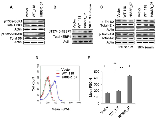We next tested whether upregulation of VPS34 affected mTOR activity and its downstream signaling pathways. Figure 2A showed that the activity of mTORC1/S6K1 as measured by T389-S6K1 and S235/236-S6 phosphorylation was dramatically increased in H868R_07 cells as compared with that of WT_118 and Vector control cells. A modest activation of mTORC1/S6K1 was observed in WT_118 cells compared with Vector control cells (Figure 2A). Figure 2B showed that 4EBP1 phosphorylation at T37/T46 was increased in H868R_07 cells as compared with WT_118 and Vector control cells. These data indicated that the ability of VPS34 to upregulate mTORC1 and its downstream signaling correlated to its kinase activity. Figure 2C showed that the activities of Akt and Erk1/2 were not changed in WT_118 and H868R_07 cells as compared with Vector cells, indicating that VPS34-mediated activation of mTORC1/S6K1 signaling was independent of class I PI3K/Akt pathway. The increase in S6K1 activity in H868R_07 cells prompted us to investigate the regulation of cell size. Quantitative analysis of flow cytometric data unveiled that H868R_07 cells have manifested a remarkable rightward shift in FSC-H histogram denoting that these cells were significantly bigger in dimensions than WT_118 (p < 0.01) and Vector cells (p < 0.01) (Figure 2D and 2E).