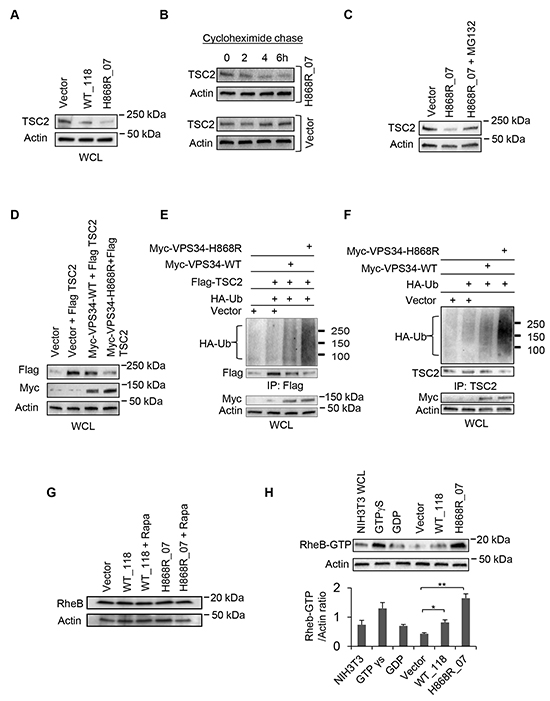 Figure 5: Binding of VPS34 to TSC1 mediates TSC2 ubiquitination and degradation, and the activation of RheB. A. Western blot analysis was performed to detect the endogenous levels of TSC2 in Vector, WT_118 and H868R_07 stable lines using anti-TSC2 antibodies. B. Cycloheximide chase experiment was performed to monitor TSC2 degradation. Vector and H868R_07 stable cells were incubated with cycloheximide at 50 μg/ml for indicated times. After incubation, WCL was collected and western blotting was performed to detect the levels of TSC2 using anti-TSC2 antibody. C. Stably H868R_07 cells were treated with MG132 at 5 μM for 24h or left untreated. WCL was subjected to western blot analysis to observe the levels of TSC2 protein expression. D. COS7 cells were transiently co-transfected with plasmids encoding the indicated proteins. 48h post-transfection, Flag-tagged TSC2 and Myc-tagged proteins in WCL were detected by Western blotting using anti-Flag antibody and anti-Myc antibody, respectively. E. COS7 cells were transiently co-transfected with Vector or the indicated Myc-VPS34 constructs along with Flag-TSC2 and HA-Ubiquitin (HA-Ub). 48h post-transfection, Flag-tagged TSC2 was immunoprecipitated from WCL using an anti-Flag antibody. Ubiquitinated Flag-TSC2 was detected by anti-HA antibody and immunoprecipitated Flag-TSC2 was detected by anti-Flag antibody. Myc-tagged proteins in WCL were detected using anti-Myc antibody. F. NIH3T3 cells were transiently co-transfected with Vector or the indicated Myc-VPS34 constructs plus HA-Ubiquitin plasmid. 48h post-transfection, endogenous TSC2 was immunoprecipitated from WCL and ubiquitinated TSC2 was detected by Western blot using anti-HA antibody. The immunoprecipitated TSC2 was detected by Western blot using anti-TSC2 antibody for assessing TSC2 degradation. The protein levels of Myc-VPS34 proteins in the WCL were detected by Western blot using anti-Myc antibody. G. Expression of endogenous RheB was monitored in WCL of Vector, and WT_118 and H868R_07 cells, which were treated with rapamycin (10 nM) for 2 days or left untreated, by Western blot analysis using an anti-RheB antibody. H. RheB activation assay was performed to assess the levels of active RheB-GTP in Vector, WT_118 and H868R_07 cell clones. The RheB-GTP was detected by Western blot analysis using a rabbit polyclonal anti-RheB-GTP antibody. Quantitative analysis of RheB-GTP and actin was determined from three independent experiments and expressed as mean ± SEM (*, p < 0.05; **, p < 0.01).