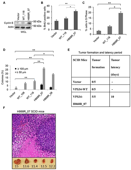 Figure 6: VPS34-H868R induces cell cycle progression, cellular transformation, and tumor formation in mice. A. Cyclin E expression levels were determined in Vector, WT_118 and H868R_07 stable clones by Western blot analysis using anti-cyclin E antibody. B. BrdU immunofluorescence staining was done on Vector, WT_118 and H868R_07 stable cell clones. Quantitative analysis of BrdU incorporation was done by counting the BrdU-positive cells in three randomly selected microscopic fields from two or more independent experiments. Data are presented as the mean percentage of BrdU-positive cells as mean ± SEM (*, p < 0.05; **, p < 0.01). C. Flow cytometric cell cycle analysis of BrdU incorporation was done in Vector, WT_118 and H868R_07 cells as described in Materials and Methods. Quantitative analysis of BrdU flow cytometric cell cycle data was performed and presented as percentage of BrdU-positive cells that are present in S phase of cell cycle. (*, p < 0.05; **, p < 0.01). D. Vector, VPS34-WT (clones WT_108 and WT_118) and VPS34-H868R (clones H868R_07 and H868R_08) expressing cells were seeded in soft agar. Cells were fed once per week with soft agar containing 10% CS. Colonies ≥ 50 μm or ≥ 100 μm were quantified on day 21 post-seeding. Data are the mean ± SEM of two or more independent experiments run in duplicate (*, p < 0.05; **, p < 0.01). E. Summary of tumor formation and latency period. Tumor latency is the time between the injection and the time of detection of a tumor larger than 5 mm. F. Representative histopathological H&E staining of tumor tissue from SCID mice injected with H868R_07 cells (magnification, x20). Lower panel: Tumor measurements in millimeters.
