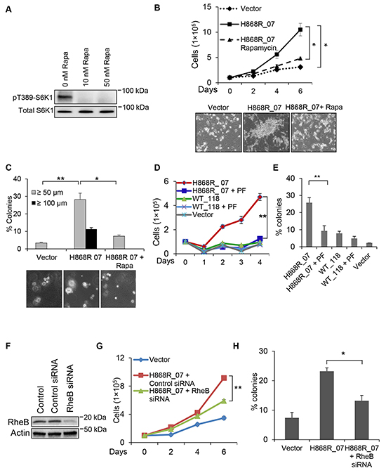 We next used pharmacological approaches to confirm that cell growth and transformation induced by VPS34 occurred via mTORC1/S6K1 pathway. Figure 7A showed that S6K1 phosphorylation in H868R_07 cells was completely inhibited by treatment of cells with 10 or 50 nM of rapamycin (Rapa), an mTORC1 specific inhibitor. Figure 7B showed that H868R_07 cells were capable of growing in low serum media (1% CS) and that on day 6 the number of H868R_07 cells was significantly higher than that of Vector cells. However, the ability of H868R_07 cells to grow in low serum was significantly reduced when cells were treated with rapamycin. As shown in representative photomicrographs at the day 6 incubation time point, H868R_07 cells displayed a spindle-like morphology, grew on the top of each other, and formed foci-like cell clusters, which are typical morphological changes observed in transformed NIH3T3 cells incubated in low serum media (Figure 7B, lower panels). These morphological changes were not observed when H868R_07 cells were treated with rapamycin. Likewise, data from soft agar assays demonstrated that rapamycin treatment significantly diminished the number of colonies formed by H868R_07 cells (Figure 7C). Furthermore, H868R_07 cells no longer formed colonies that were ≥ 100 μm when incubated with rapamycin. PF-4708671 (PF) is a specific inhibitor of S6K1. PF treatment also significantly inhibited the growth of H868R_07 cells in low serum media (1% CS) in comparison with untreated H868R_07 cells (p < 0.01) (Figure 7D). It should be noted that WT_118 cells did not confer a proliferative advantage in low serum media, suggesting the upregulated lipid kinase activity of VPS34 was essential for VPS34 to induce growth in low serum. Consistent with these findings, we also noticed a significant decline in colony formation when H868R_07 cells were incubated with PF as compared with untreated H868R_07 cells (Figure 7E). We further extended our study to investigate whether loss of RheB could affect the ability of H868R_07 cells to grow in low serum and to form colony in soft agar. RheB knockdown was achieved using RheB specific siRNA (Figure 7F). As shown in Figure 7G and 7H, RheB silencing in H868R_07 cells significantly inhibited the growth of these cells in low serum media (Figure 7G) and significantly impaired the ability of these cells to form colonies in soft agar (Figure 7H). Taken together, these findings indicate that VPS34-induced cellular transformation is mediated by mTORC1/S6K1 signaling pathway.