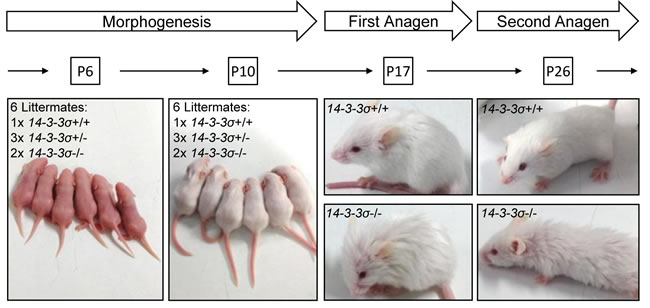 Figure 1: 14-3-3σ knock-out mice show a disorganized fur from postnatal day 17 onwards. Heterozygous 14-3-3σ knock-out mice were intercrossed and pictures of the offspring with the indicated genotypes were taken at the indicated time-points.