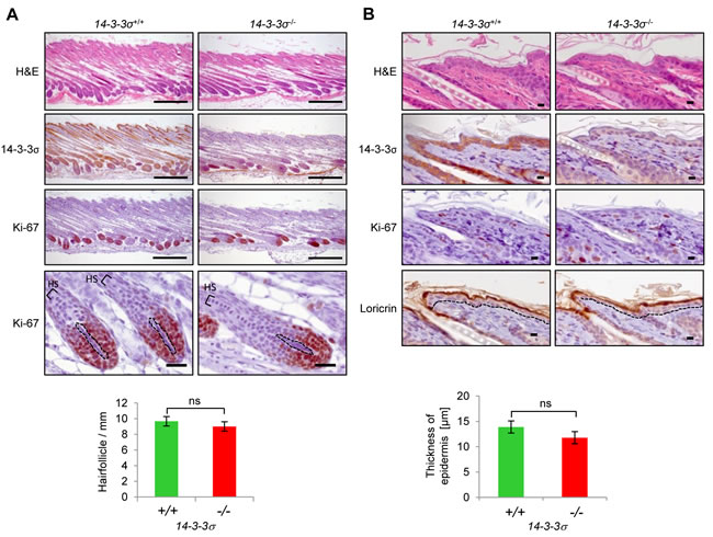 Figure 2: Comparison of back skin morphology in 14-3-3σ+/+ and 14-3-3σ-/- mice. Back skins from wild-type and 14-3-3σ knock-out mice were resected at postnatal day 17, paraffin embedded, vertically sectioned and stained with haematoxilin/eosin (H&E, upper panels) or subjected to immunohistochemistry with 14-3-3σ, Ki-67, and Loricrin specific antibodies. A. Hair follicle density (scale bar = 300 µm) and hair shaft (HS) morphology (scale bar = 30 µm) are visible. The dashed line indicates the dermal papilla. Bar-chart: The average number of hair follicles per millimeter skin section was evaluated (n = 3). B. A higher magnification of the interfollicular epidermis and the underlying dermis is shown (scale bar = 10 µm). The dashed line indicates the border between epidermis and dermis. The Loricrin staining shows the outermost layer of the epidermis. Bar-chart: The average epidermal thickness was evaluated (n = 3).