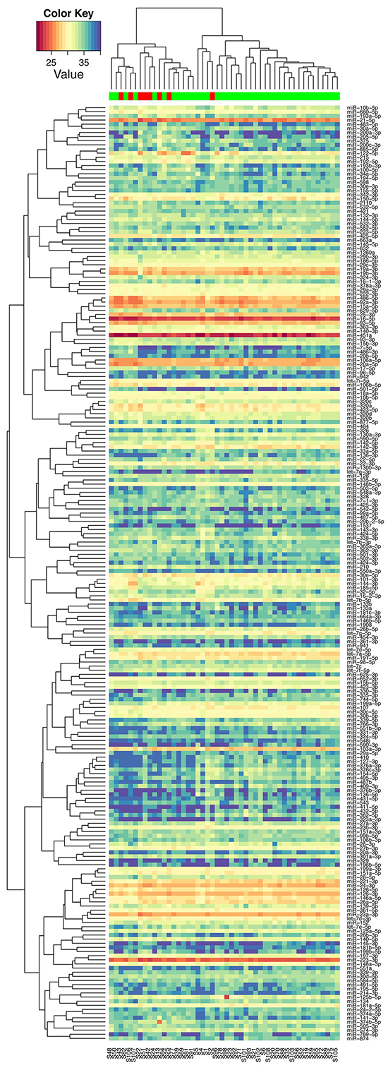 In the discovery phase, we first excluded miRNAs that were detectable in less than half of the samples as these miRNAs are usually unreliably measured. Then we normalized Cq values to global mean. Here, high Cq value indicates low expression. When a miRNA was undetected in a sample, its Cq value was set to the maximum Cq across all samples plus 1 (usually set to 38). Moderated t test was used to identify miRNAs differentially expressed between patients with recurrence and those without recurrence. The variances in calculating of the t statistics were moderated using empirical Bayes approach [48]. Benjamini-Hochberg’s false discovery rate method was used to correct for multiple testing. All miRNAs with p<0.05 were candidate miRNAs and we chose independent miRNAs among these candidate miRNAs for further validation. Specifically, we only chose the miRNA with low mean Cq value (i.e. the more reliable one in PCR experiment) if two were highly correlated with correlation coefficient>0.7. Hierarchical clustering analysis with Spearman correlation as the similarity measure was conducted to summarize the overall pattern of miRNA expression.