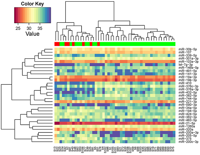 The study was conducted in two phases. In the discovery phase, expression of miRNAs from sera was evaluated using miRCURY LNA Universal RT microRNA Ready-to-Use PCR Human panels I+II V3.M (Exiqon), which contains assays for 752 human microRNAs. Reverse transcription (RT) was performed using the Universal cDNA synthesis kit II (Exiqon) with the addition of two spike-ins (UniSp6 and cel-miR-39-3p) to the RT reaction. For quantitative PCR (polymerase chain reaction), 1:80 water diluted cDNA products were mixed at a 1:1 ratio with the ExiLENT SYBR Green Mastermix (Exiqon) that had Rox Reference Dye (Life Technologies) previously added to it. For quality control purpose, one RNA sample was measured twice and a sample containing nuclease-free water and carrier RNA was profiled as negative control. GenEx software (Multi-D) was used for data pre-processing including inter-plate calibration, evaluation of isolation and reverse transcription efficiency, setting specific cut-offs for negative control microRNA Cq values, and duplicates averaging. We performed global mean normalization with the assumption that the majority of miRNAs were not related to disease status so can reflect overall quantity of RNA added. MicroRNAs with a Cq value > 37 were deemed to be not detected.