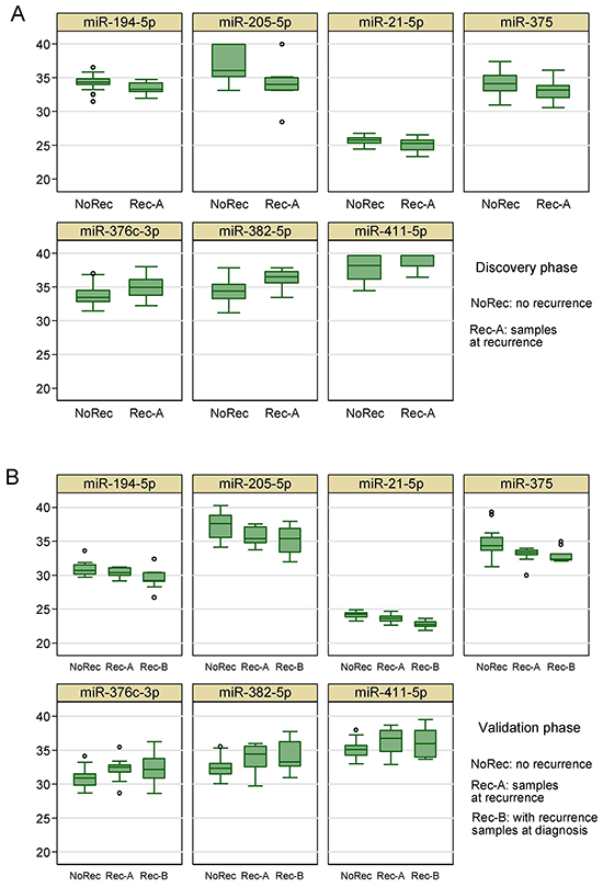 Figure 9: Box plots of the 7-miRNA signature in 4 repeated experiments show that the signature can reproducibly distinguishes patients with and without breast cancer recurrence.