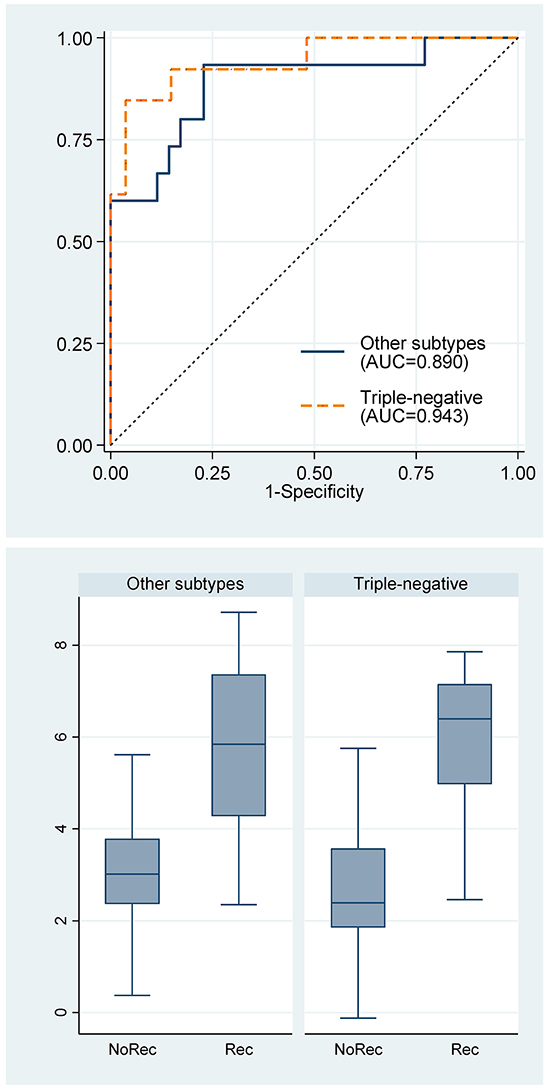 Figure 6: Receiver operating characteristic curves for the 7-miRNA signature and box plots of the 7-miRNA signature by breast cancer subtypes. Rec, recurrence; NoRec, no recurrence; TN, triple-negative subtype; Non-TN, other subtypes.