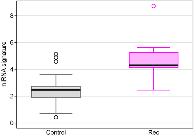 Figure 7: Box plots of the 7-miRNA signature in breast cancer patients with recurrence compared with non-cancer controls.