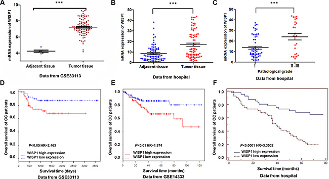 Figure 1: Correlation between WISP1 expression and survival time of patients with CC. (A, B) Analysis of WISP1 expression level in CC samples by bioinformatics analysis in GSE33113 and Fudan University Shanghai Cancer Center Hospital datasets. (C) Statistical analysis on the pathological stage of CC patients in WISP1 expression from Fudan University Shanghai Cancer Center hospital. (D–F). Effect of the expression level of WISP1 on the overall survival of patients with CC in GSE33113, GSE14333 and Fudan University Shanghai Cancer Center Hospital datasets. The cut-off level was set at the median value of the WISP1 expression levels in CC patients. The WISP1-higher expression tumors have a poor prognosis compared to the WISP1-lower expression tumors. ***P < 0.001.