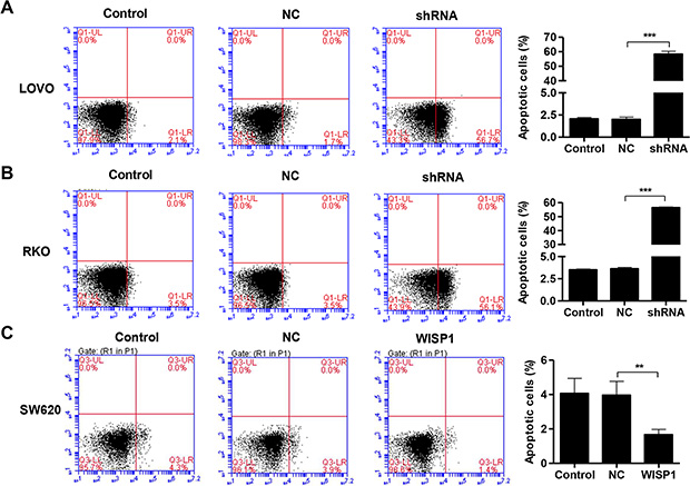Figure 4: WISP1 shRNA promotes cell apoptosis. (A–C). LOVO, RKO and SW620 cells treatment with pLVX-AcGFP-C1-shWISP1 (shWISP1) or pLVX-AcGFP-C1-WISP1 expressing vector (WISP1) were stained with annexin V-fluorescein and apoptosis rates was analyzed using flow cytometry. shNC: pLVX-AcGFP-C1-scramble shRNA negative control. NC: black pLVX-AcGFP-C1 negative control. ***P < 0.001.