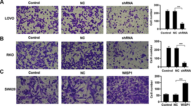 Figure 5: WISP1 shRNA inhibits invasion. (A–C). LOVO, RKO and SW620 cells treatment with pLVX-AcGFP-C1-shWISP1 (shWISP1) or pLVX-AcGFP-C1-WISP1 expressing vector (WISP1) and invasion was determined by transwell assays. shNC: pLVX-AcGFP-C1-scramble shRNA negative control. NC: black pLVX-AcGFP-C1 negative control. ***P < 0.001.