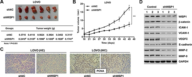 Figure 8: Knockdown of WISP1 in CC cells reduces tumor growth in vivo. LOVO cells infected with pLVX-AcGFP-C1-scramble shRNA negative control (shNC) or pLVX-AcGFP-C1-shWISP1 (shWISP1) were subcutaneously injected in athymic nude mice. (A) At day 45, mice were sacrificed and tumors were weighted. (B) Tumor growth was evaluated for 45 days. (C) Histology and PCNA expression were detected by HE staining and immunohistochemistry (IHC) assays. (D) Western blot analysis identified significant decrease in WISP1, β-catenin, ICAM-1, VCAW-1, VEGFC, MMP-2 and MMP-9, while increase in E-cadherin expression in LOVO cells infected with pLVX-AcGFP-C1-shWISP1 (shWISP1). shNC: pLVX-AcGFP-C1-scramble shRNA negative control. Scale bar: 10 mm. #P < 0.001, ***P < 0.001.
