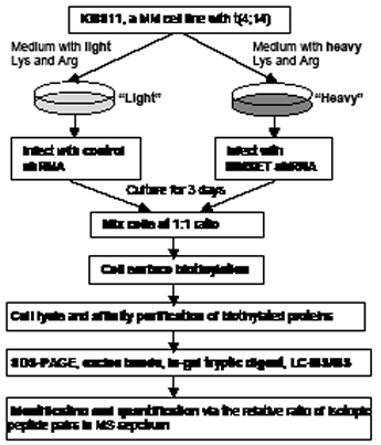 Figure 1: Schematic showing the experiment strategy for the relative quantification of cell surface membrane proteins. KMS11 cells were cultured in medium with either light Lys and Arg (12C6 L-Lycine and 12C6 14N4 L-Arginine) or heavy Lys and Arg (13C6 L-Lycine and 13C6 15N4 L-Arginine) for a minimum of 6 doubling times, and then treated with control shRNA or MMSET shRNA. After 3 days, cells were mixed at 1:1 ratio and enriched cell surface protein fractions were prepared by cell surface biotinylation and NeutrAvidin-affinity chromatography. The enriched membrane proteins were analyzed by SDS-PAGE. The entire gel lane was segmented into approximately 20 sections, followed by in-gel tryptic digestion. Peptide extracts were analyzed by nanoLC Orbitrap-MS, and the protein precursors were identified using Mascot Server. Finally relative quantification of protein expression was determined by the chromatographic response observed for each isotopic peptide pair in the MS.