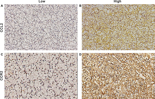 Figure 1: CCL2 and CCR2 expression in ccRCC tissues. Representative photograph of CCL2 (A and B) and CCR2 (C and D) immunostaining in tissue microarrays. Original magnificent (200×).