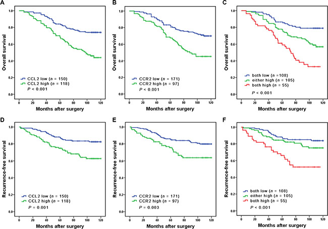 The construction of tissue microarray and the immunohistochemical procedure were performed as previously described [27]. Primary Anti-CCL2 antibody (diluted 1:200; ab9669, Abcam) and Anti-CCR2 antibody (diluted 1:200; ab32144, Abcam) were used for immunohistochemical staining. The immunostaining intensity was evaluated independently by two pathologists without any knowledge of the patients’ outcomes and clinicopathological features. A semi-quantitative score, which ranges from 0 to 300, was used to describe the intensity of staining. It was calculated by multiplying the staining intensities (0: negative; 1: weak staining; 2: moderate staining; 3: strong staining) by the area distributions (0–100%).