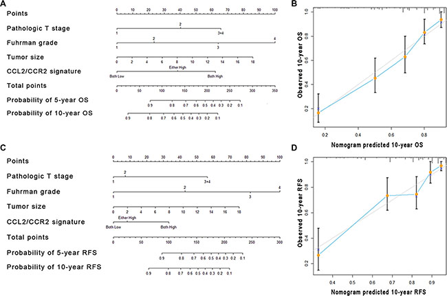 Figure 4: Nomogram and calibration plots for the prediction of outcome in patients with non-metastatic ccRCC. Nomogram to predict OS and RFS at 5 and 10 years after nephrectomy (A and C), the calibration plots for predicting OS and RFS at 10 years (B and D).