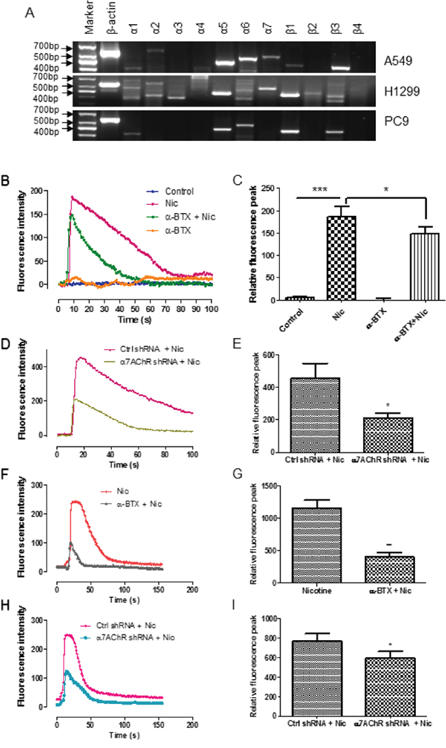RT-PCR analysis showed the expression of the α7 subunit transcripts in A549 and H1299 cells but not in PC9 cells (Figure 1A). The α7 subunits formed functional nAChRs in the NSCLC cells, because the cells responded to nicotine by an increase of intracellular calcium influx (Figure 1B, 1C, 1D, 1E, 1F, 1G, and 1H) and the effect was hampered by the α7-nAChR selective antagonist α-bungarotoxin (α-BTX) (Figure 1B, 1C, 1F, and 1G) or by the knockdown of the α7 subunit via RNA interference (Figure 1D, 1E, 1H, and 1I).
