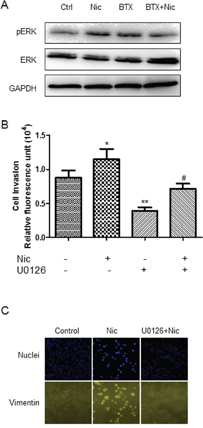 The role of ERK in MEK/ERK signaling pathway in nicotine-induced invasion has not been well understood. Western blot showed that nicotine induced an up-regulation of ERK phosphorylation, indicating an activation of MEK/ERK signaling pathway (Figure 4A). The activation of MEK/ERK signaling was attenuated by α7-nAChR selective antagonism (Figure 4A). Inhibition of MEK/ERK pathway by U0126 decreased the nicotine-induced increase of cell invasion as shown in ECMatrix-based assay (Figure 4B) and abrogated nicotine-induced up-regulation of vimentin as shown in high-content analysis (HCA) (Figure 4C).