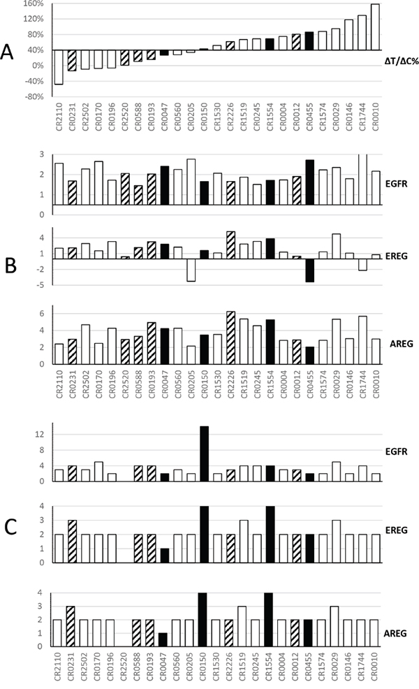 Figure 1: Summary of cetuximab activity and corresponding genomic profiles of EGFR, Epiregulin and Amphiregulin in a cohort of CRC-PDXs. Panel A. Waterfall plot of the ΔT/ΔC% of PDX: cetuximab vs. control, ranked from responders on the left to non-responders on the right (Y-axis: ΔT/ΔC). The open bars are wild type KRAS, the solid bar are KRAS G12D/V/C mutants, and the shaded bars are KRAS G13D mutants. Panel B. For 25 models ranked as in panel A, y axis shows RNA expression intensity [13], from top to bottom, for EGFR, EREG and AREG. RNA values are in log10 scale. Panel C. For 25 models ranked as in panel A, Y axis shows gene copy number per PICNIC [13]. The cetuximab treatment in mice was extensively described previously [13]. Briefly, when tumor volume reaches 100–150 mm3, the mice were grouped and subjected to either PBS or cetuximab (IP, weekly for 2 weeks, 1mg per mouse).