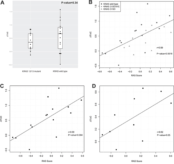 Figure 2: RAS pathway activity and cetuximab activity in a cohort of CRC-PDXs. A. RAS signature score distribution in KRAS 12/13 mutants and KRAS 12/13 wild types. B-D. Correlation between RAS signature scores and tumor growth inhibition by cetuximab (ΔT/ΔC) in all 25 PDX models (B), in 15 KRAS 12/13 wild type PDX models (C), and in 10 KRAS 12/13 mutant PDX models (D).