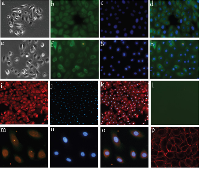 Figure 1: Primary cell culture of CP samples. a-d. Primary cell culture of aCP; a. morphology of aCP cells; b-d. aCP cells are positive for pan-CK. (400×) e-h. Primary cell culture of pCP; e. morphology of pCP cells; f-h. pCP cells are positive for pan-CK.(400×) i-l. β-catenin and V600E expression in cultured aCP cells; i-k. nuclear β-catenin translocation is detected in cultured aCP cells; l. V600E immunoreactivity is absent in cultured aCP cells. (400×) m-p. β-catenin and V600E expression in cultured pCP cells; m-o. V600E immunoreactivity is observed in cultured pCP cells with strong detection in the cytoplasm; p. β-catenin is restricted to the cell membrane of cultured pCP cells. (400×)