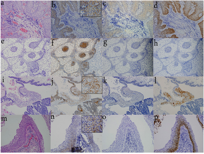 Figure 2: Differential distribution pattern of β-catenin, V600E, and TREM-1 in CPs and RCCs. a. H&E staining of pCP indicates the squamous and well-differentiated, non-keratinizing epithelium. (200×) b. Nuclear β-catenin translocation is not observed and β-catenin expression is restricted to the cell membrane. (200×) c. V600E immunoreactivity is observed in the SE of pCPs with strong detection in the cytoplasm, while it is not detected in the nuclei. (200×) d. TREM-1 immunoreactivity is strongly detected in the cytoplasm and nuclei of the SE in all pCPs. (200×) e. H&E staining of pure aCP shows the classical appearance with peripheral palisading epithelium, loose ‘stellate reticulum’, and whorl-like cells. (200×) f. β-catenin translocation is observed especially in whorl-like cells. (200×) g. V600E immunoreactivity is not detected in pure aCP tissues. (200×) h. TREM-1 immunoreactivity is also absent in pure aCP tissues. (200×) i. H&E staining of “mixed type CPs” shows both SE and peripheral palisading epithelium, whorl-like cells are also detected. (200×) j. β-catenin translocation is observed in whorl-like cells and is restricted to the cell membrane in SE of “mixed type CP”. (200×) k. V600E immunoreactivity is absent in SE and other components of “mixed type CP”. (200×) l. TREM-1 immunoreactivity is observed in the SE of “mixed type CP” and absent in other components of “mixed type CPs”. (200×) m. H&E staining of RCC with stratified SE. (400×) n. No nuclear β-catenin translocation is observed and β-catenin expression is restricted to the cell membrane. (400×) o. V600E immunoreactivity is absent in SE. (400×) p. TREM-1 immunoreactivity is observed in the SE. (400×)