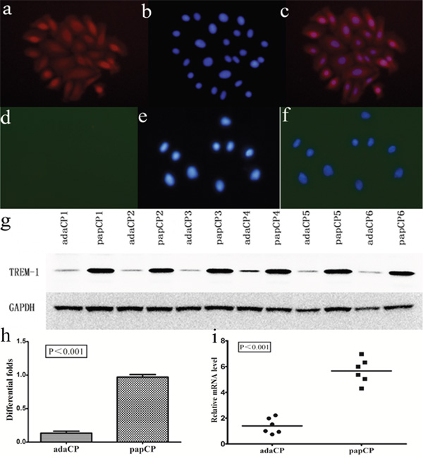 Figure 3: TREM-1 expression pattern in aCP and pCP cells. a-c. TREM-1 expression is strongly detected in the cytoplasm and nuclei of pCP cells. (400×) d-f. TREM-1 expression is absent in aCP cells. (400×) g-h. Western blotting shows the protein level of TREM-1 in cultured CP cells. Evaluation of the relative TREM-1 expression revealed a significantly (p < 0.001; up to 7.19 fold) lower level in aCP (mean = 0.13 ± 0.07) compared to that of the pCP variant (mean = 0.97 ± 0.03) i. TREM-1 mRNA levels of aCP and pCP cells were compared by qRT-PCR. TREM-1 relative expression level was significantly (p < 0.001; up to 4.045 fold) higher in pCP (mean = 5.66 ± 0.39) compared to that of the aCP variant (mean = 1.40 ± 0.25).