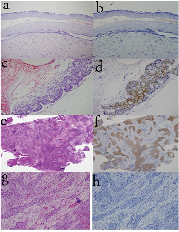 Figure 5: TREM-1 expression in other SE tissues. a-b. TREM-1 immunoreactivity is absent in normal cervical squamous epithelium. (100×) c-d. TREM-1 immunoreactivity is observed in metaplastic cervical squamous epithelium and strongly detected in the cytoplasm and nuclei. (200×) e-f. TREM-1 immunoreactivity is observed in squamous cell lung cancer (originating from metaplastic SE). (40×) g-h. TREM-1 immunoreactivity is absent in tongue carcinoma (originating from SE). (200×)