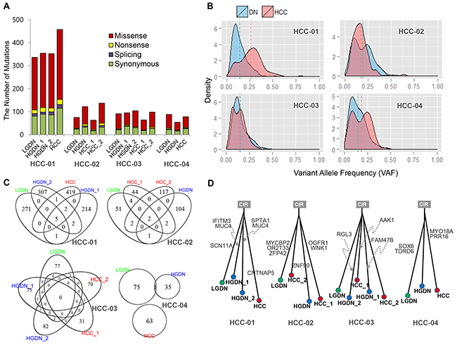 Figure 1: Mutations identified in dysplastic nodules (DNs) and Hepatocellular Carcinoma (HCC). A. The number of mutations detected; B. Comparison of variant allele frequency (VAF) distribution between DNs and HCC; C. Overlap of mutations between DNs and HCC; D. The phylogenetic trees inferred from the mutation profiles.