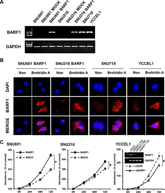 Figure 1: EBV BARF1 protein was mainly secreted and promoted cell proliferation. (A) BARF1 mRNA was detected in SNU601 BARF1 and SNU216 BARF1 cells (stable transfection with BARF1) and in naturally Epstein-Barr virus (EBV)-infected stomach cancer cells (SNU719 and YCCEL1), whereas it was undetectable in SNU601 mock cells and SNU216 mock cells. (B) As seen by fluorescence microscopy, BARF1 protein was hardly observed in SNU601 BARF1 cells and was weakly detected in SNU216 BARF1, SNU719 and YCCEL1 cells, whereas BARF1 protein accumulated in cells that were treated with Brefeldin A. BARF1 antibody (MAb 6F4) was labeled in red, and nuclei were counterstained with DAPI (blue). (C) Cell proliferation was higher in SNU601 BARF1 and SNU216 BARF1 cells than in SNU601 mock cells and SNU216 mock cells, respectively, and lower in YCCEL1 cells transfected with BARF1-specific siRNA (siBARF1) than in YCCEL1 cells transfected with scrambled siRNA (siSCR) (*P < 0.05). All experiments were performed in triplicate.