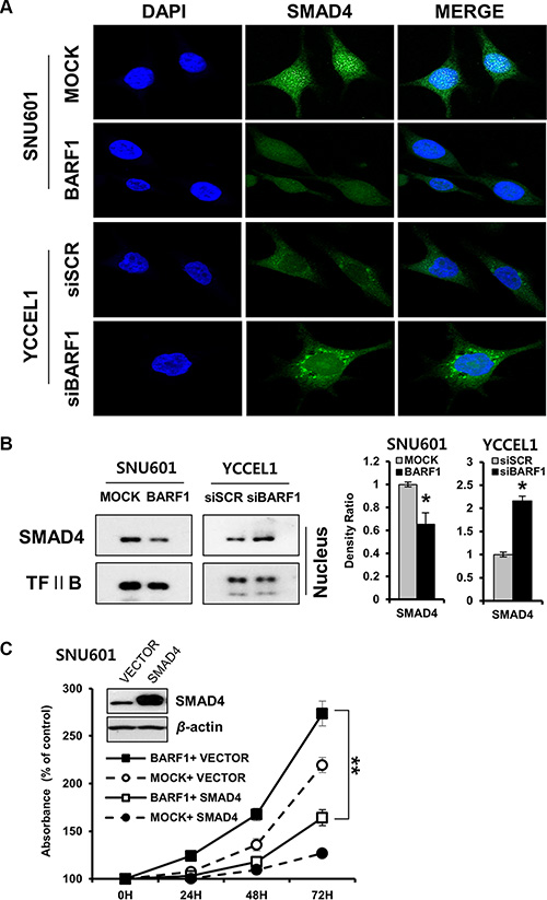 Figure 4: BARF1-mediated down regulation of nuclear SMAD4, and the effect of SMAD4 on cell proliferation. (A) Immunofluorescence was visualized via confocal microscopy. BARF1 attenuated nuclear SMAD4 in SNU601 BARF1 cells, whereas BARF1 inhibition augmented nuclear SMAD4 in YCCEL1 cells transfected with siBARF1. Cells were labeled with SMAD4 antibody (green), and nuclei were counterstained with DAPI (blue). (B) Western blotting of nuclear extracts confirmed the BARF1-mediated downregulation of nuclear SMAD4 (*P < 0.05). TFII B was used as a loading control. (C) SNU601 BARF1 and SNU601 mock cells were transfected with pCMV-SMAD4 (SMAD4) or pCMV-empty vector (VECTOR). Cell proliferation was suppressed by pCMV-SMAD4 transfection compared with cells transfected with empty vector (**P < 0.01). All experiments were performed in triplicate.
